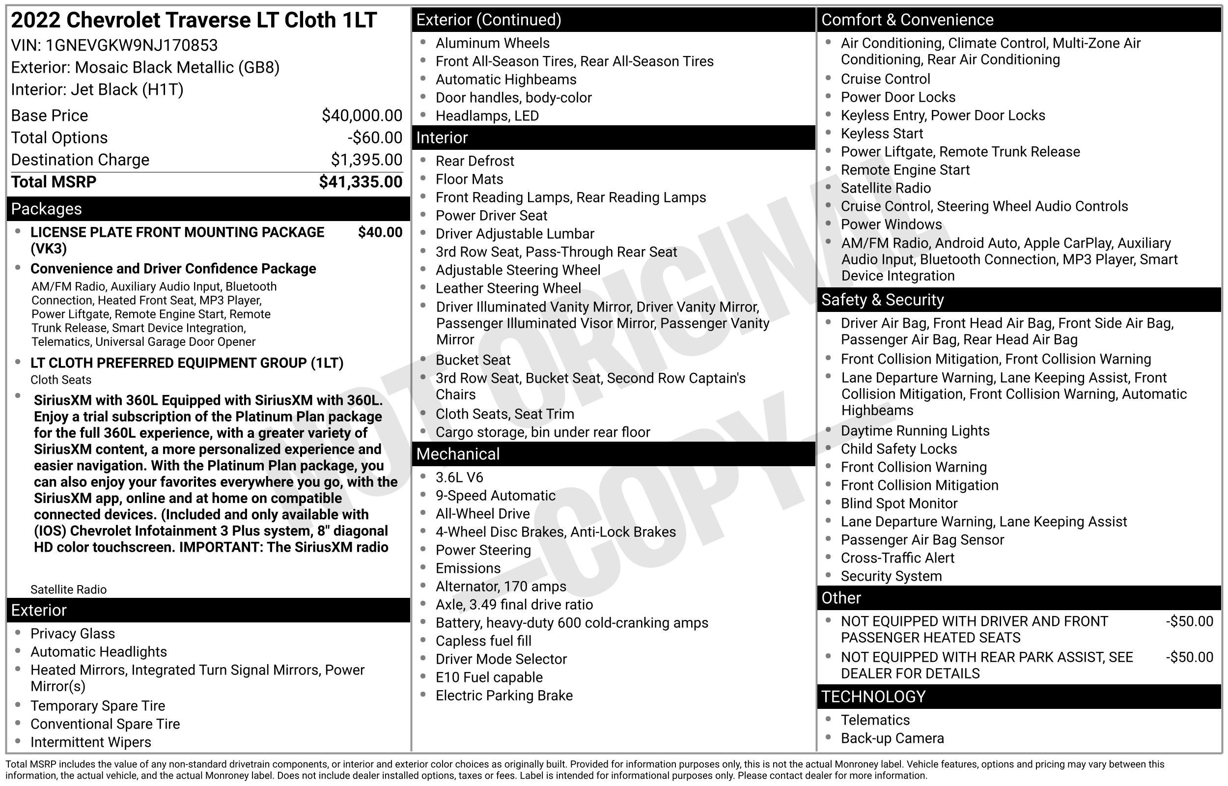2022 Chevrolet Traverse LT 1LT AWD 3.6L V6 SIDI VVT 9-Speed Automatic Mosaic Black Metallic