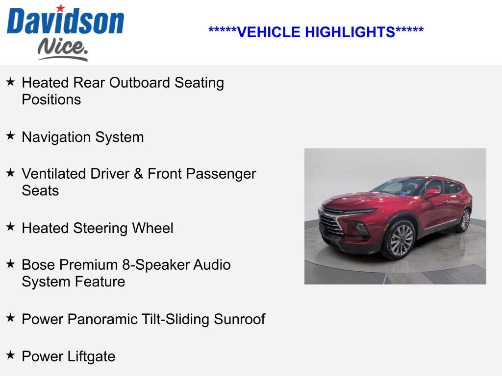 Heated Rear Outboard Seating Positions, Navigation System, Ventilated Driver & Front Passenger Seats, Heated Steering Wheel, Bose Premium 8-Speaker Audio System Feature, Power Panoramic Tilt-Sliding Sunroof, Power Liftgate, Blazer Premier, 4D Sport Utility, 3.6L V6 SIDI, 9-Speed Automatic with Overdrive, AWD, Radiant Red Tintcoat, Jet Black Leather.